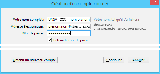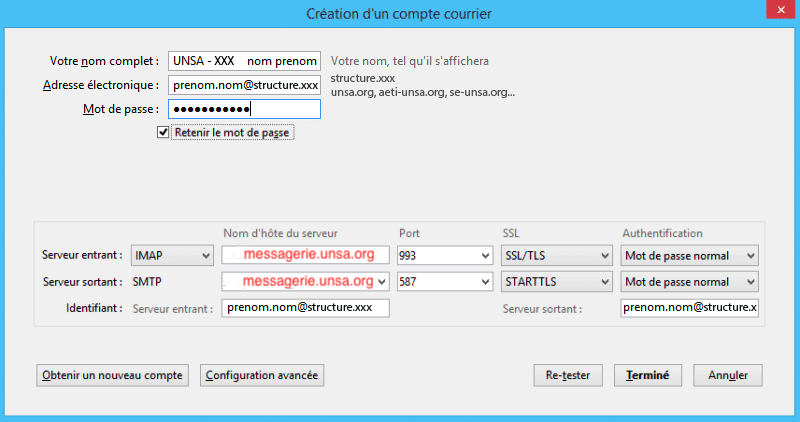 Serveur entrant : Le serveur de réception des courriels : messagerie.unsa.org